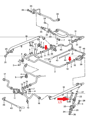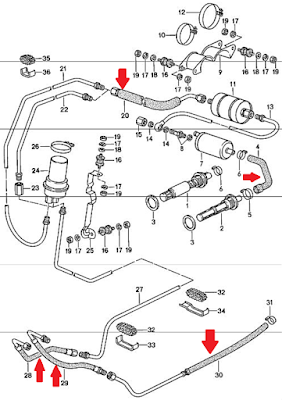 In the specific case of the rubber replacement I ended up getting the High Pressure Fuel Line and the Fuel Line Clamp Kit from 928 Motorsports.  This way I knew I had the right line and the right clamps for the application.  Also knowing Carl has used this combination in several cases in the past made me comfortable that this was a tried and true method.  Carl even has a PDF document outlining how to work with the clamps and line. The images below indicate with red arrows the hoses that need to be replaced for the 1983 928s.