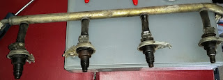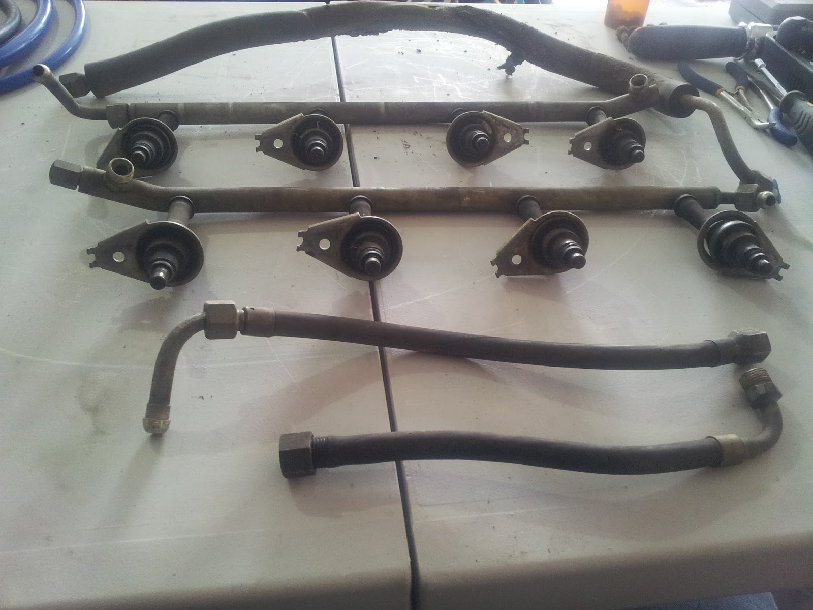 The image to the right is what things look like once your have changed all the rubber.  I did a little clean up on the fuel rails, that the injectors connect to as well, before replacing them in the engine bay.  The re-installation is pretty straight forward for the injector rails but the interconnection hoses between the fuel distribution system in the engine bay and the hard fuel lines to the rear of the vehicle were annoying to get to and frustrating to disconnect and reconnect on the hard fuel line side.  A combination of tight access and the tight lock of the nuts managed to coax more than a few curse words and an equal number of beer breaks before we were able to get them release and then back into place.  Thank god I have a strong liver and sound proof  (mostly) Garage. Some clean up was done prior to replacing the injectors but I will save that for another post.