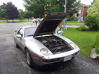 There were 24 listings at the time in Canada selling a Porsche 928 however only 6 were manual and of the 6 only 3 were in our budget and in driving distance.  The first one we looked at was a 1982 in the colour red.  The body was in pretty good shape but the engine bay was a mess. The big concern was what damage has been done and the noticeable whine coming from the rear end.  In the end we felt it was not worth the risk and we passed.  The second was a silver 83 in Georgetown Ontario. It had been listed at a price that was outside our budget but just barely.  We figured we could try to negotiate the price lower and see what happens.  We took a look at it and right away saw that the body was in fantastic shape.  The engine bay was complete and the engine was running strong.  There were issues that would need to be dealt with mind you.  The biggest issue was the clutch needed to be done but other smaller things like electric motor on the driver's side seat was intermittent, license plate light needed a bulb, clutch safety switch was not working, parking break light switch was not working. Less technical but still annoying was the smell of the interior of the car.  It obviously was stored in a barn extensively and the smell reflected it.   We also knew from the 928 community that there was rubber in the fuel lines that needed to be replaced and that it was very time consuming to complete.  After giving the car the once over we decided to talk it over and think about it a bit.  We had another car to consider as well.  After about a two weeks of trying to line up a chance to look at the third car unsuccessfully we decided to have another look at the silver 83.  By now the car had been listed for some time and there were very few bites apparently.  Based on what we know about the work that was needed and the price he was asking I think it was understandable.  The person buying it had to be committed to the project.  We managed to negotiate the current owner to a number that was inside our budget and pulled the trigger.  The current owner was great about everything.  He helped us get the car certified and even gave us the complete set of workshop manuals.  It would quickly become apparent that we now had a new obsession to keep our original obsession company.  Here are a few pictures of the car in its state when we purchased it.